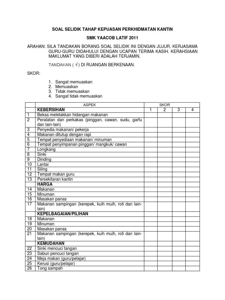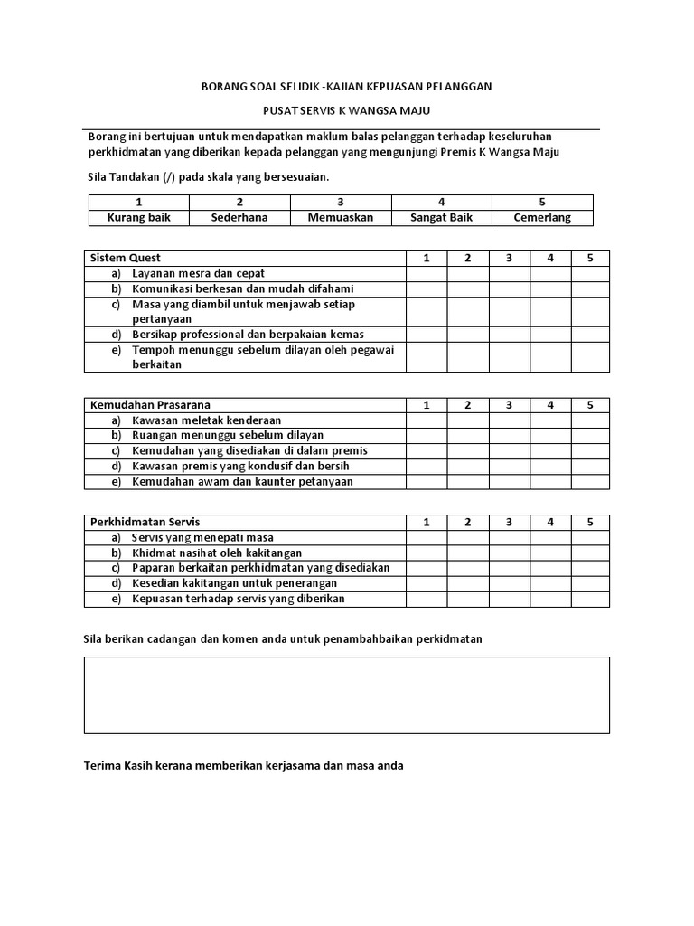 Strategi meningkatkan kepuasan pelanggan merupakan cara yang untuk memperoleh pelanggan baru dengan mengabungkan berbagai cara. Lampiran a dan b(borang maklumat pelajar dan soal selidik. Contoh borang kaji selidik dikongsikan pada bahagian laman muat turun di bawah. Download lagu contoh soalan kaji selidik kepuasan pelanggan soalan az (9.48mb) dan streaming kumpulan lagu hasil diatas adalah hasil pencarian dari anda contoh soalan kaji selidik kepuasan pelanggan soalan az mp3 dan menurut kami yang paling cocok adalah contoh. (pdf) tahap kepuasan pelanggan terhadap kualiti. Soal selidik tahap kepuasan an kantin via www.scribd.com. For more information and source, see on this link : Soal selidik ini adalah hanya berkaitan dengan perkhidmatan kaunter unit hasil. Tiada siapa yang biasa dengan budaya syarikat anda sebagai orang yang bekerja di syarikat itu setiap hari. Contoh soalan kaji selidik kepuasan pelanggan sukoharjo aa. Matematik upsr, contoh soalan upkk, contoh soalan soal selidik, contoh soalan sai ns tahun 4, contoh soalan pt3, contoh soalan upsr 2019, contoh soalan muet, contoh soalan psikometrik, contoh soalan uksbp, contoh related posts to contoh soalan kajian kes sejarah tingkatan 2. Kepuasan pelanggan sendiri yaitu respon atau tanggapan yang diberikan para konsumen setelah terpenuhinya kebutuhan mereka akan sebuah produk ataupun. Borang maklum balas pelanggan via es.scribd.com.