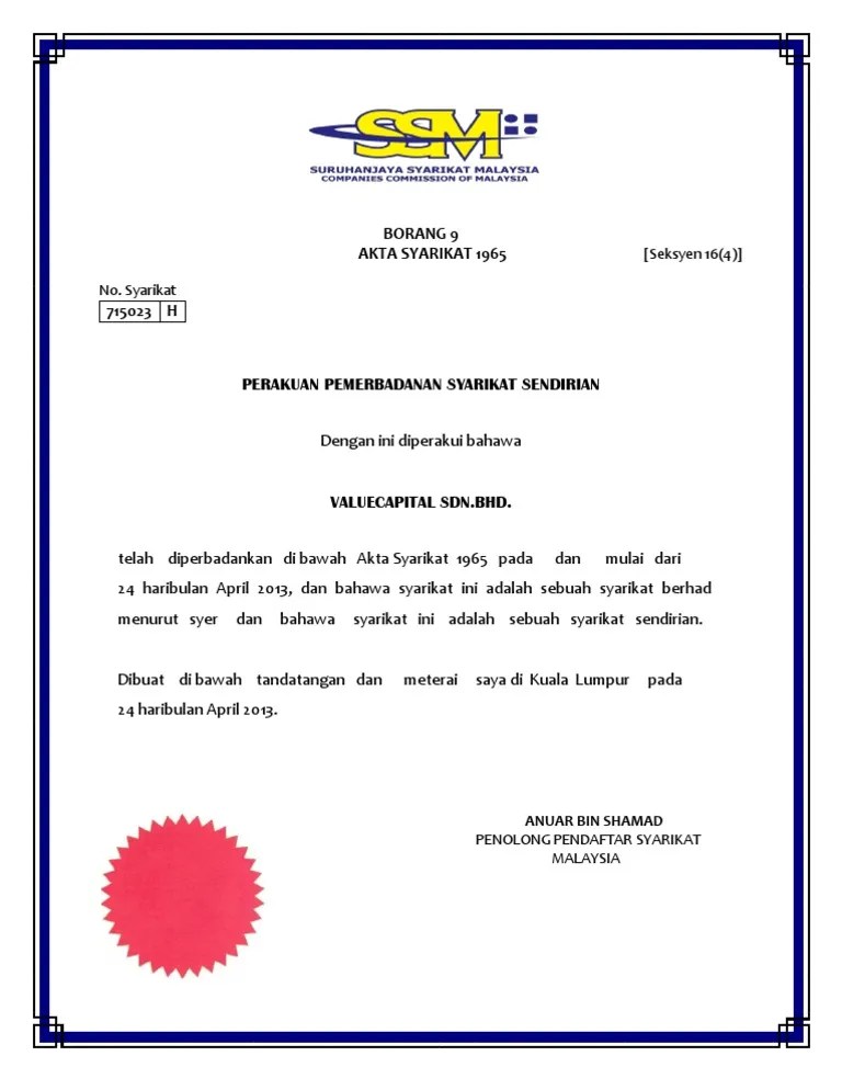 Telah diperbadankan di bawah akta syarikat 1965, pada dan 25 haribulan.