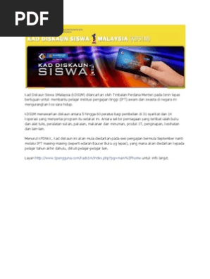 Related : Kad Diskaun Siswa 1 Malaysia / Seperti diketahui umum, kad diskaun siswa 1malaysia (kads1m) diwujudkan untuk membantu meringankan perbelanjaan siswa di institusi pengajian tinggi (ipt) awam dan swasta di seluruh negara..