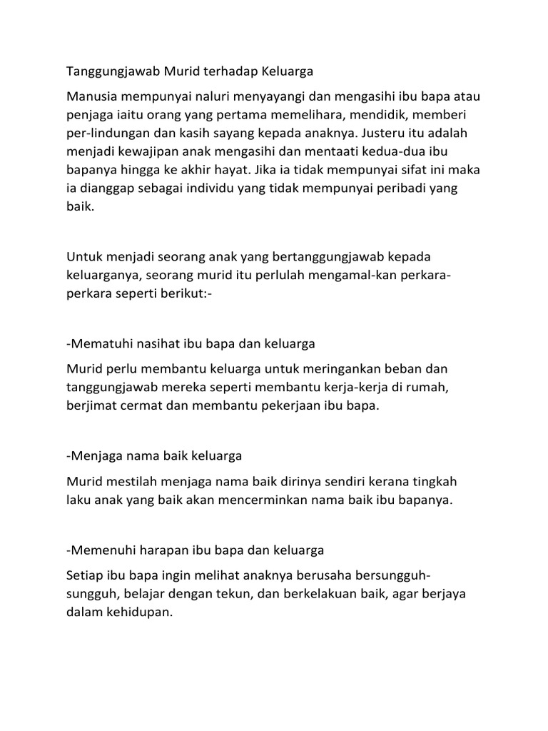 Tanggungjawab Seorang Anak : Malah ia bertambah pada isteri.. Contoh tanggung jawab pada keluarga yaitu seorang ayah harus menyelamatkan keluarganya dari kemiskinan, karena ayah merupakan kepala keluarga. Menyampaikan syarahan yang bertajuk tanggungjawab sebagai. Orang tua memiliki tanggung jawab untuk membentuk sikap dan karakter anak. Sikap tanggung jawab ini tentunya sangat penting bagi kehidupan di dunia, baik dalam hal beribadah ataupun hubungan sosial. Tidak berbohong pada anggota keluarga.